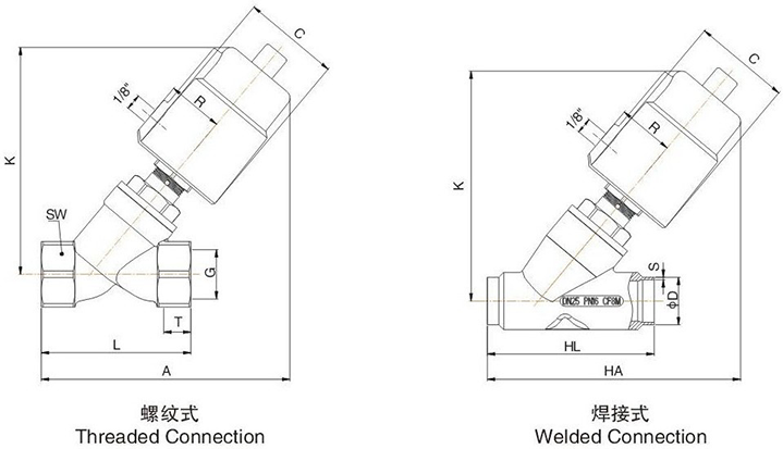 | size | actuator (mm) | C | R | K | Threaded connection | Welded connection | |||||||||||||