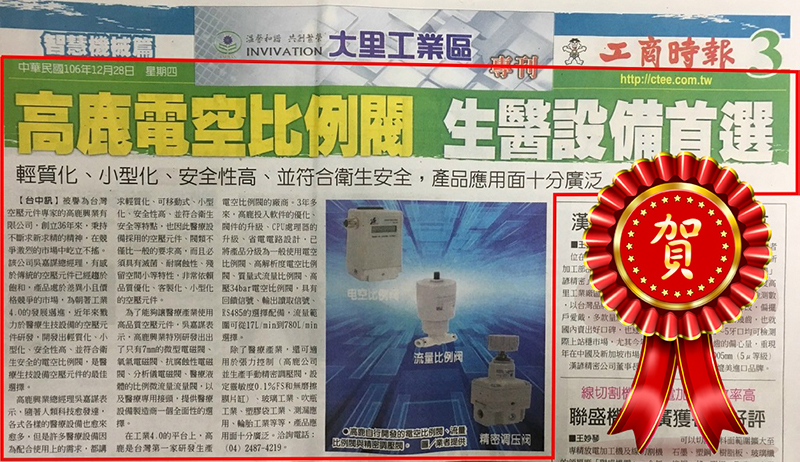 工商時報106年12月28日報導 - 高鹿電空比例閥 生醫設備首選