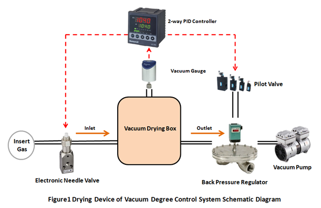 For vacuum drying equipment with a closed cavity structure, the precise control of vacuum degree inside the drying equipment can be achieved directly by controlling the pressure. The specific pressure control device is only connected to the right part of the drying box in Figure 1 (back pressure valve and vacuum pump), and uses an external vacuum gauge combined with a PID controller to adjust the degree of vacuum.