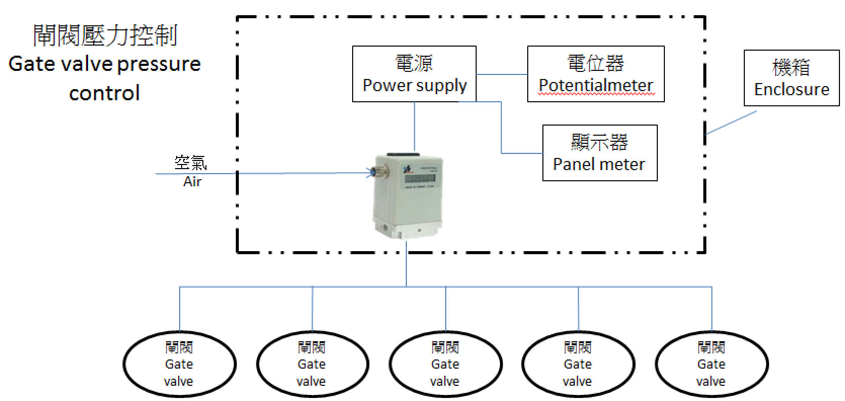 QKL proportional pressure regulator (electro-pneumatic regulator) can be used in gate valve pressure control applications to remotely actuate the gate valve open and closed. In this drawing, a QKL electronic pressure regulator is controlling the pressure on the dome of several gate valves in a wood curing process. Variable pressure on the dome of the regulators controls the air pressure going to furnaces. Also QKL proportional pressure control valve assembly is placed inside an enclosure – this can be used to protect against heat or to meet hazardous location requirements.