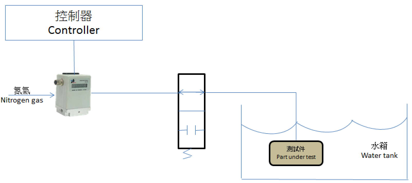 QKL electronic pressure regulator is controlling the pressure of nitrogen gas for this high pressure leak testing application. A command signal is given to the QKL electro-pneumatic valve by a controller to reach the desired pressure. The part under test is submerged, thus bubbles will appear if there is a leak in the part.