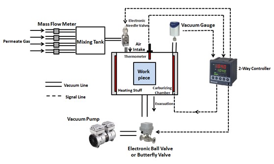 As shown in Figure 1, in order to reach the adjustment and control of air intake flow, a gas mixing tank is added to the intake end of carburizing chamber, and a gas mass flow meter is used to distribute various permeated gases into the gas mixing tank. The gas flows through the electronic needle valve for flow regulation and control.