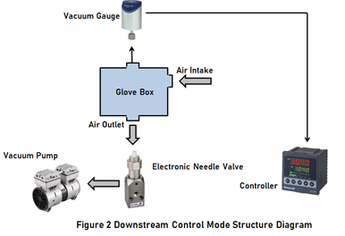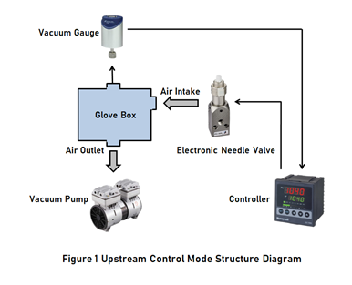 As shown in Figure 1, under the condition that the pumping speeds of downstream vacuum pump is kept constant. The upstream control mode is to adjust the opening of proportional flow control valve of upstream air intake port through PID vacuum pressure controller according to the measurement signal of vacuum gauge, that is, by controlling intake flow to keep pressure in glove box at the set point. Upstream mode is often used for high vacuum control.