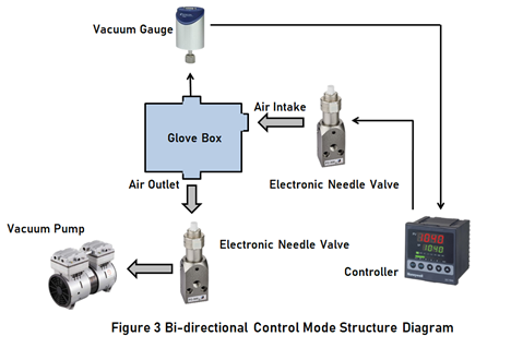 The above upstream and downstream control modes have their own advantages, and are rarely used alone in practical applications. Generally, the upstream and downstream modes are integrated together, which is the so-called bi-directional control mode, as shown in Figure 3. In bi-directional control mode, the vacuum pressure controller is required to have forward and reverse control functions, that is, reverse control for upstream proportional flow control valve and reverse control for downstream proportional flow control valve.