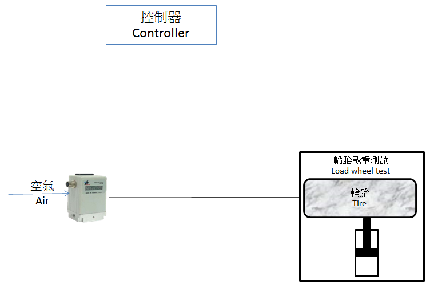 A tire uniformity test machine is designed to measure force variation, run out, and sidewall appearance. This basic sketch shows a QKL proportional pressure regulator being used to inflate the tire for testing and maintaining pressure as the load wheel test is accomplished.