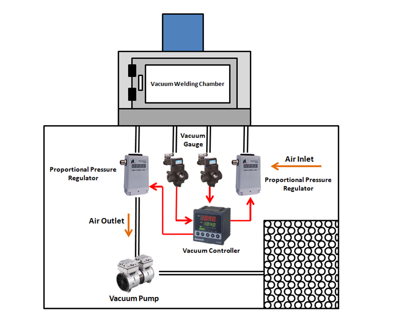 The vacuum gauge is connected to the second channel of PID controller. The PID controller adjusts proportional pressure regulator by comparing the received vacuum signal with set value, so that air pressure in welding chamber quickly reaches the set value and remains constant.