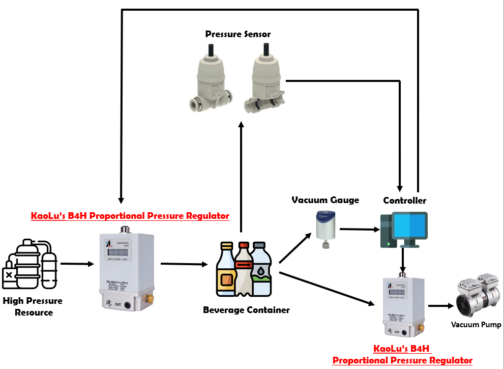 그림 1에 표시된 솔루션은 음료 용기의 진공도와 고압을 별도로 제어할 수 있으며, 진공 게이지와 압력 게이지를 사용하여 음료 용기의 진공도와 질소 충전 중 질소 압력을 각각 측정합니다.