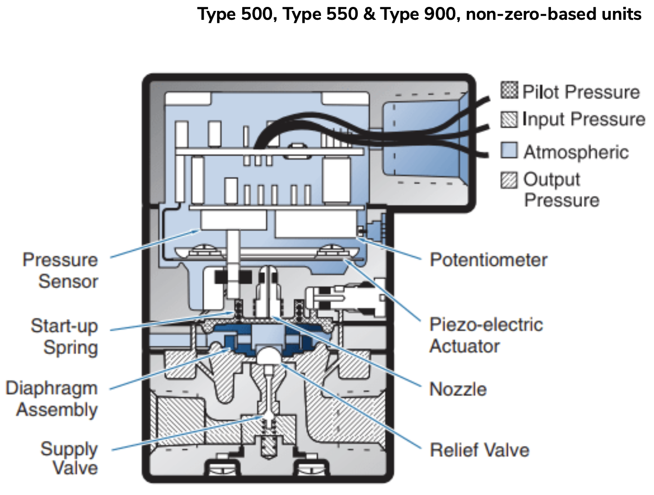 Both of the above units (Type 900 and Type 500) operate on similar principles, a downward force is applied, via a start-up spring, to the diaphragm in the pilot chamber which in turn opens a supply valve to generate a small amount of output pressure. During electrical regulation, while the mechanism that increases this downward force differs, in both cases you’ll notice that the pilot chamber is fed via air on the output side of the unit. What this means, is that in a non-powered situation we would expect there to be some amount of air that passes from supply to output. Without this air, the pilot chamber would not be able to apply a force on the supply valve.