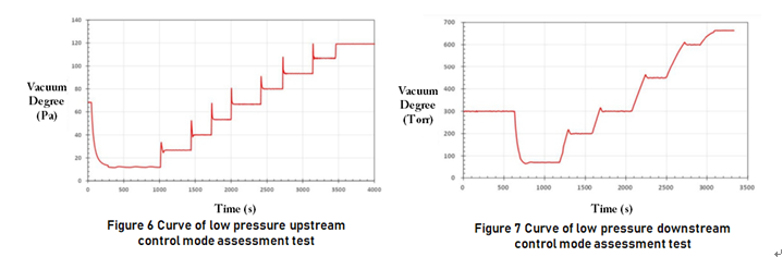 During the upstream mode test, vacuum pump was first turned on and then pumped at full speed. Then the PID parameters of controller were self-tuned at about 68Pa. After the auto-tuning is completed, 8 set points of 12, 27, 40, 53, 67, 80, 93 and 107Pa are controlled respectively. The air pressure changes during the whole control process are shown in Figure 6. During the downstream mode test, vacuum pump was first turned on and then pumped at full speed, and air intake electric needle valve was adjusted to the position of micro intake. Then the PID parameters of controller were self-tuned at about 300torr. After the auto-tuning is completed, 5 set points of 70, 200, 300, 450 and 600 Torr are controlled respectively. The air pressure changes during the whole control process are shown in Figure 7.