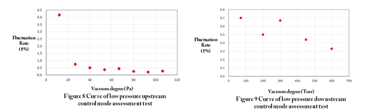 By expressing the above control effects at different low pressure constant points as fluctuation rate, fluctuation rate distribution in the entire range shown in Figures 8 and 9 is obtained. It can be seen from fluctuation rate distribution diagram that fluctuation rate can be accurately controlled within the range of ±1% in the whole range of low pressure. The large fluctuation at 12Pa is because the PID parameters obtained by self-tuning at 68Pa are invalid, and a separate PID parameter self-tuning is required.