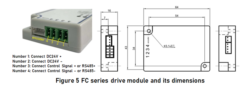 FC pneumatic proportional flow control valve is equipped with a stepper motor drive circuit module, which provides the required power supply and control signal for FC pneumatic proportional flow control valve, and converts the DC signal into step control of bipolar stepper motor, and can also provide RS485 direct control of serial communication. Its specifications and dimensions are shown in Figure 5.