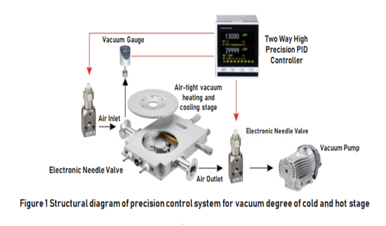 The overall structure of the vacuum degree precision control system of the airtight vacuum cooling and heating stage is shown in Figure 1. The whole system mainly includes a vacuum gauge, a numerical control needle valve, a PID controller and a vacuum pump. In order to improve the accuracy of vacuum measurement and control, a capacitive vacuum gauge with higher measurement accuracy (up to 0.2% of full scale) is used, which can cover the vacuum range of 0.01 to 760 Torr. If a higher vacuum environment is required, a Pirani vacuum gauge can also be used for measurement and control. In order to reach full-range vacuum control, two electronic needle valves are installed at the air inlet and outlet of hot and cold stage respectively. By adopting the upstream and downstream control modes respectively, precise control with a full-scale fluctuation rate of less than ±1% can be reached. The controller is the key to precise control. The high-precision PID controller of 24-bit A/D and 16-bit D/A is used in the scheme, and the independent dual-channel is convenient for upstream and downstream gas flow regulation and control. In conclusion, cost-effective precision control of KaoLu’s FC series electronic needle valve is possible with this proven vacuum control solution.