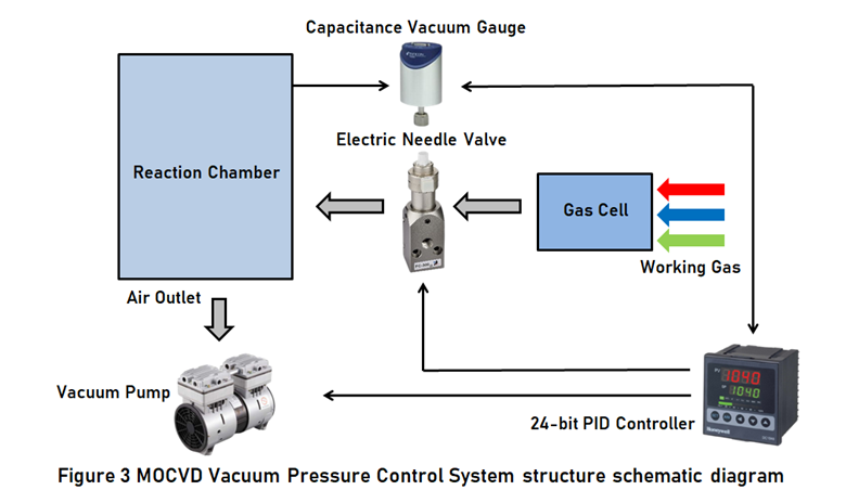 Within the working pressure range of MOCVD, it is generally required that the working pressure in the reaction chamber can be accurately controlled and can stay constant at any set point within a certain range. In order to meet the precise control of different pressure ranges of low and high pressure, the proposed pressure control scheme is to add an upstream control mode to the original downstream control mode. The structure of vacuum pressure control system is shown in Figure 2, and the details are as follows: